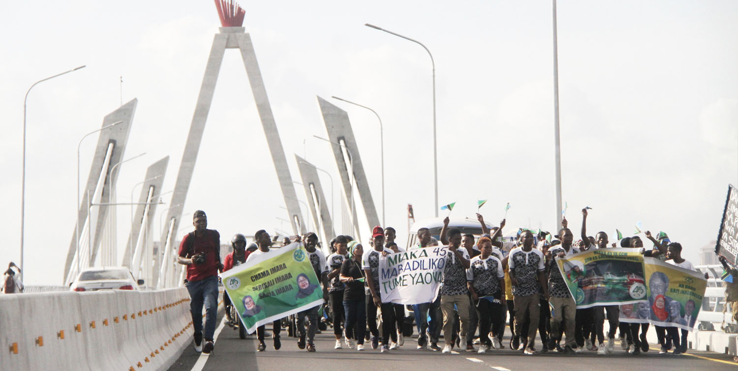 Vijana waliokuwepo katika eneo hilo, walibeba bendera za Tanzania na mabango yaliyosomeka ‘Miaka 45, mabadiliko tumeyaona’, ‘Na bado kazi inaendelea’ na ‘Miaka 45 ya CCM Dar es Salaam kama Dubai’.